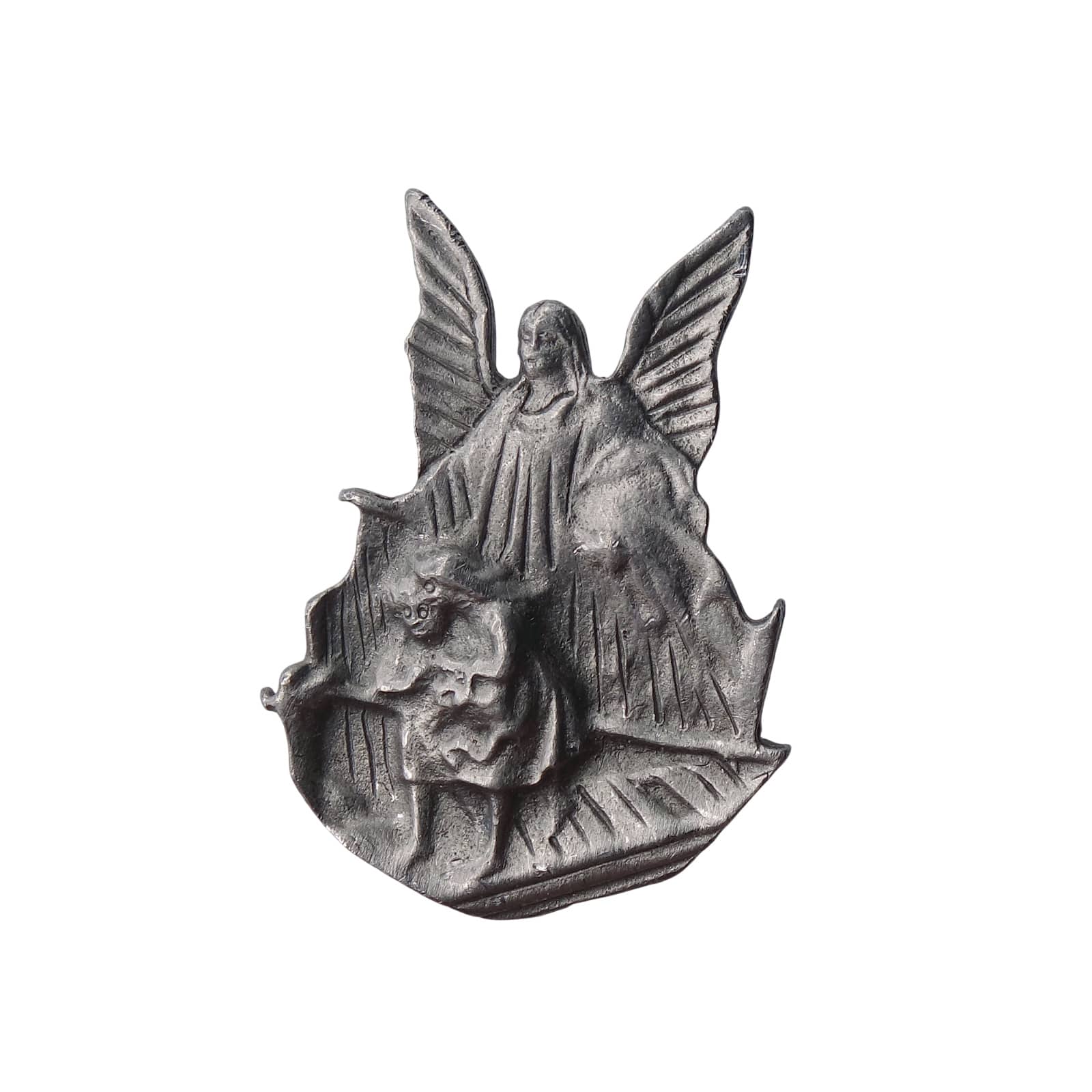 大きな羽を広げた守護天使が、小さな子供に寄り添い見守る姿を象った、慈愛あふれるデザイン。